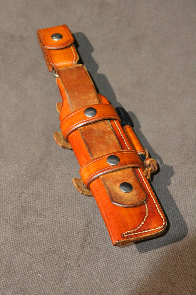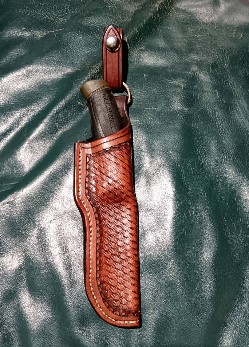 Die einfache Gürtelschlaufe ist für kürzere Messer geeignet. Durch einen Druckknopf an der Schlaufe läßt sich die Scheide am Gürtel anbringen ohne diesen öffnen zu müssen.