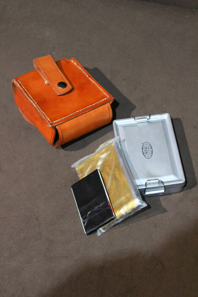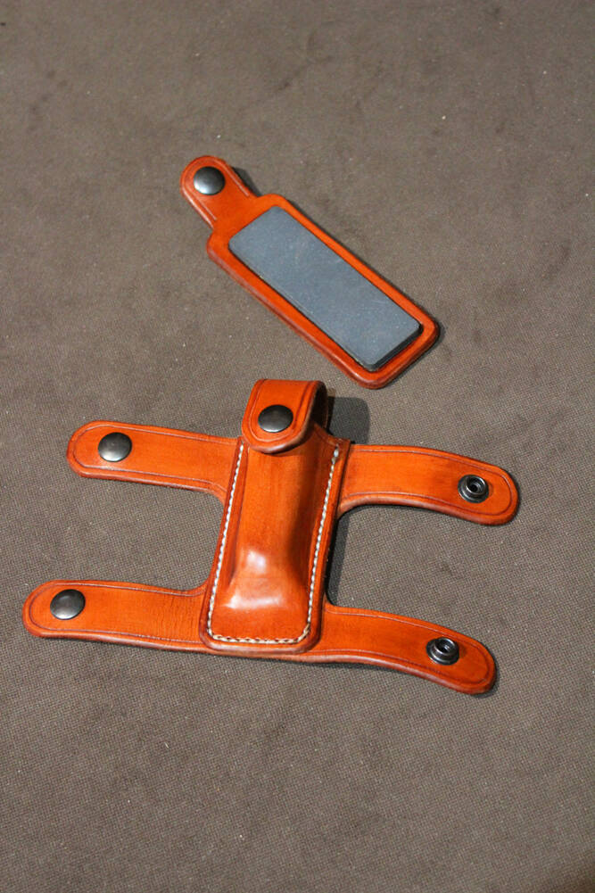 für Taschenmesser und Schleifstein. Durch den in doppetlem Leder eingebtteten Schleifstein, läßt sich das Messer bequem und ohne Verletzungsgefahr schärfen.